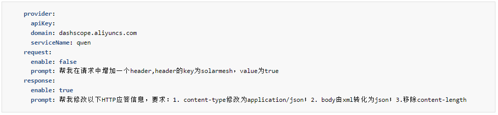 AI-Transformer 是 SolarMesh AI 插件中的一大亮点。通过配置 AI 请求/响应转换插件,用户无需编写复杂代码,即可使用自然语言来调整服务的请求和响应数据。这一功能在测试场景中尤为实用,测试人员可以基于原始请求/响应,自动生成用于边界条件测试的新请求/响应,大大提高了测试的全面性和效率。例如,通过简单的自然语言指令,即可实现 HTTP 应答信息的自动化修改,如修改内容类型、转换数据格式、移除特定头等。